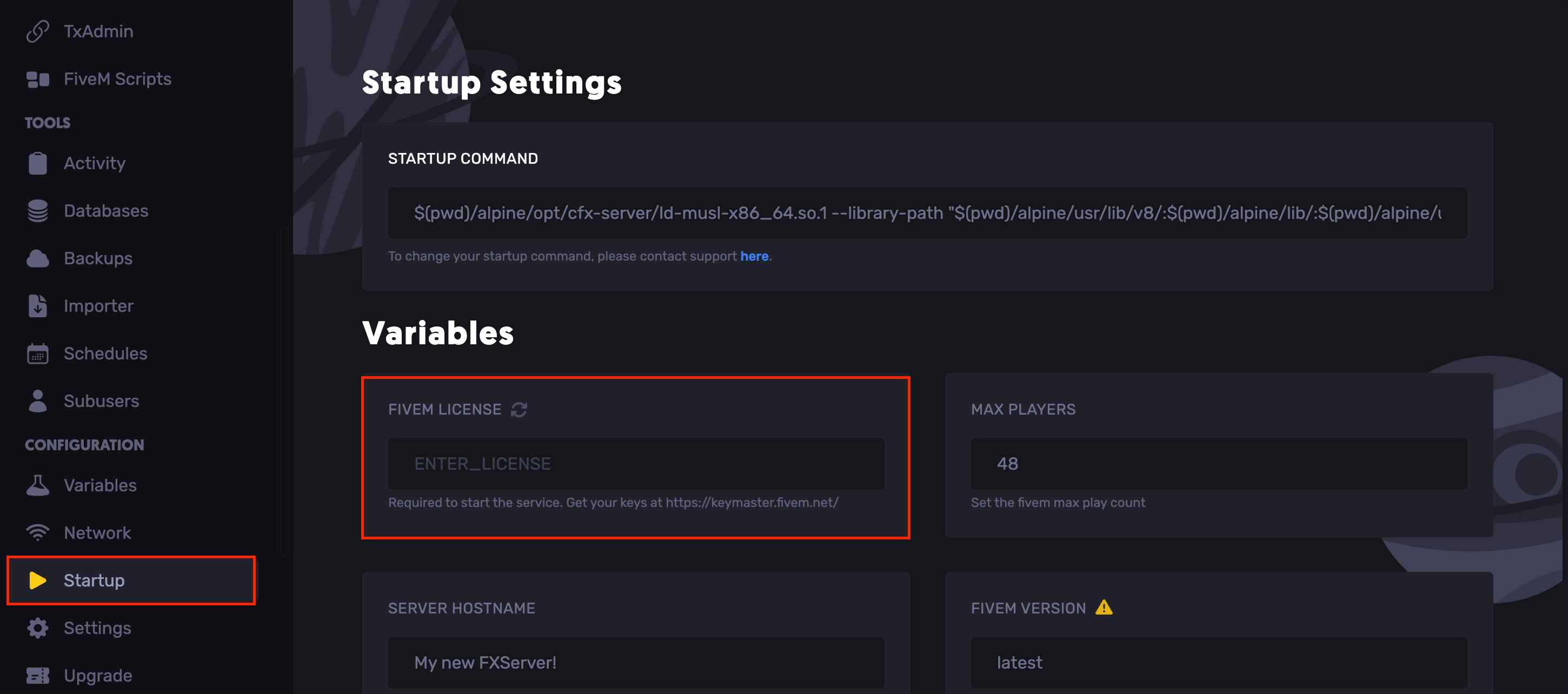 After you’ve created your key, copy it and head over to the Rocketnode Panel. Access your server by clicking on it and go to the Startup tab, located on the left side of the panel. Scrolling down, you will see a section called Fivem License. You will need to enter the previous key into this section.