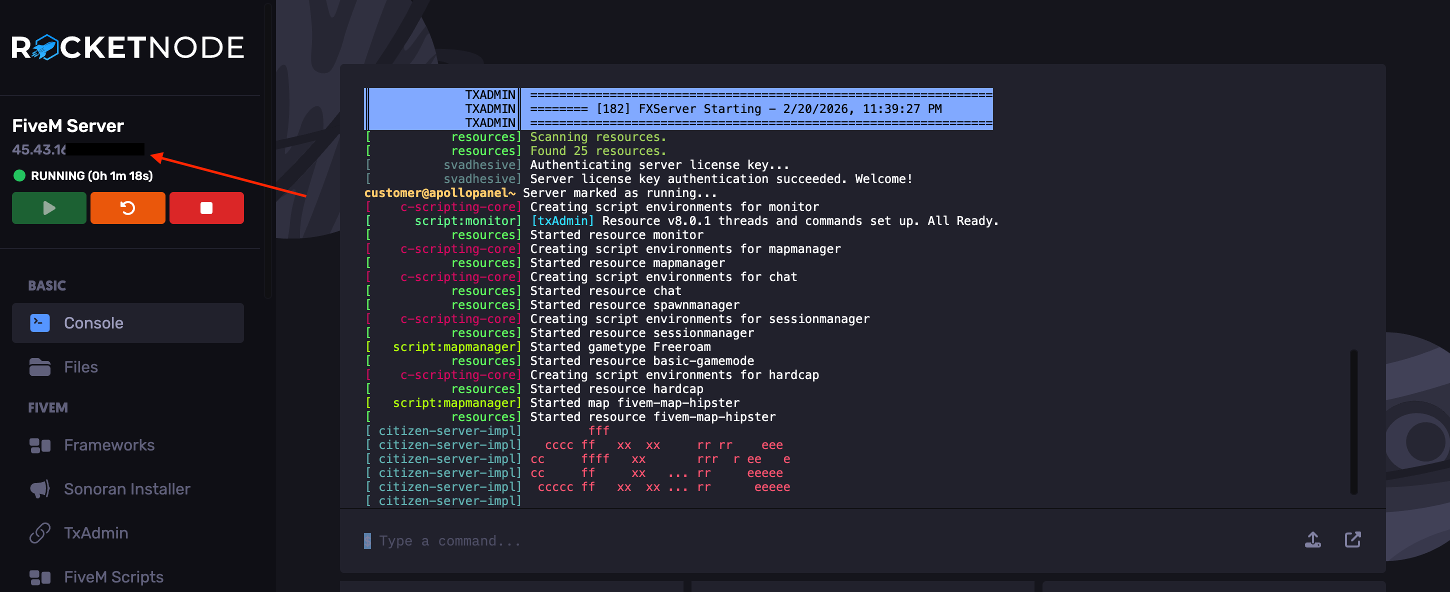 To get your FiveM server’s IP address, head over to the RocketNode Panel and view your FiveM server console. Your IP will be in the top box under your server’s name.