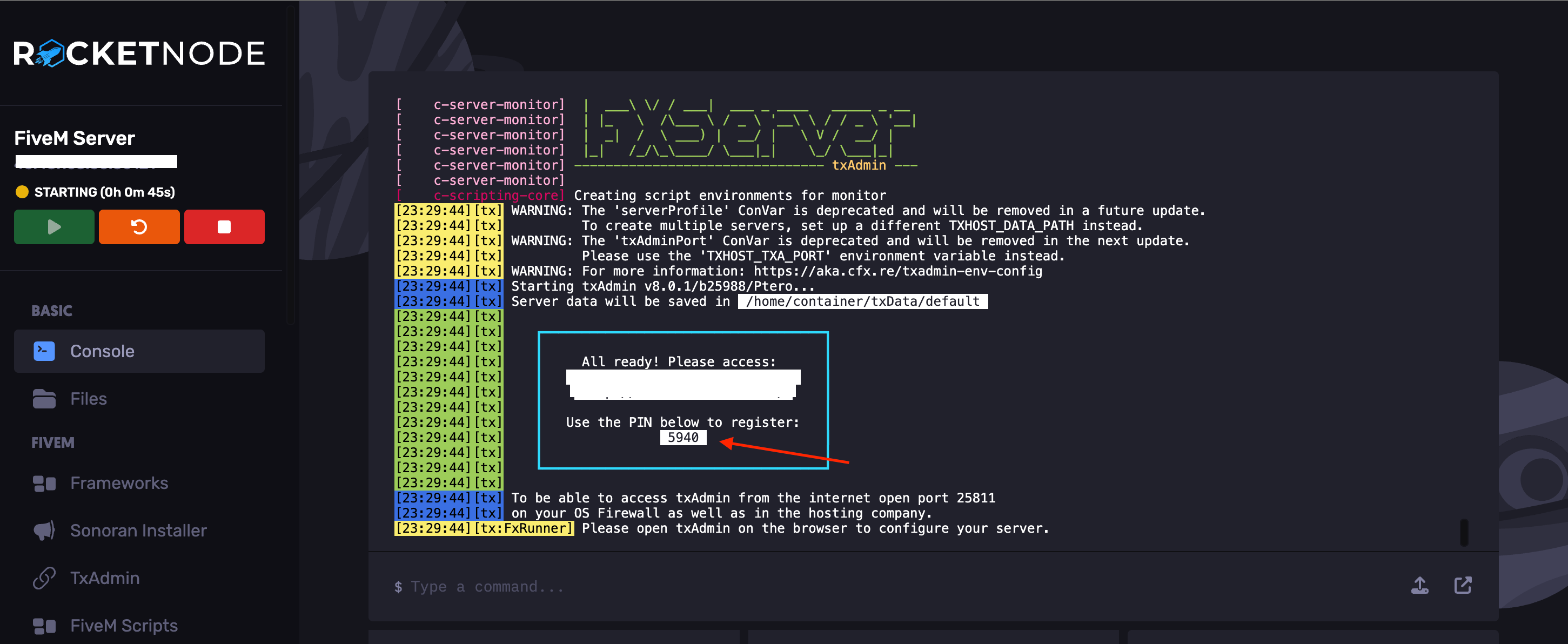 In the console, find the PIN labeled Use the PIN below to register. Enter this PIN in your txAdmin to verify ownership.