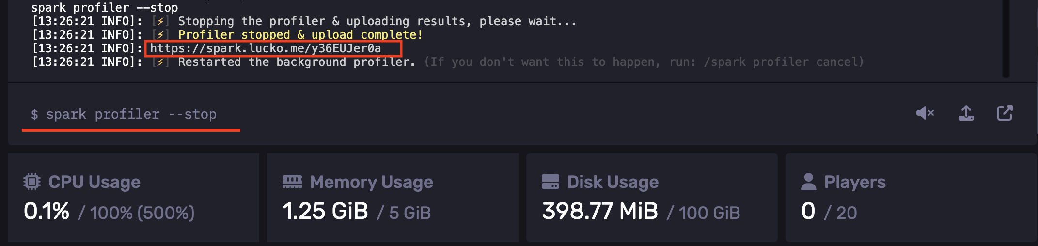 Give it 10 minutes, then enter `spark profiler –stop`.
